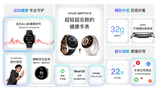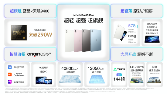同期发布的IoT新品中,vivo Pad5 Pro搭载安卓平板全球首发的蓝晶×天玑9400芯片,安兔兔综合跑分突破290万大关,是大屏移动游戏与轻办公生产力的新选择,售价2999元起;vivo Pad SE则定位学习平板,配备纸感护眼屏,售价999元起。vivo WATCH 5专注健康监测与运动指导,售价799元起。