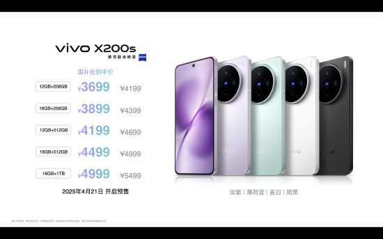 vivo X200s有12GB+256GB版本、16GB+256GB版本、12GB+512GB版本、16GB+512GB版本、16GB+1TB版本,售价分别为4199元、4399元、4699元、4999元和5499元,享受国家补贴后到手价分别为3699元、3899元、4199元、4499元、4999元。